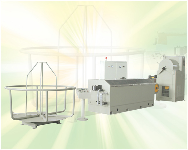 机组构成: 本机组主要由放线架、拉线主机、连续退火装置、储线装置、双盘收线装置、齿轮箱润滑油系统、电控系统,并附有轧头穿模机相配套,组成整套机组